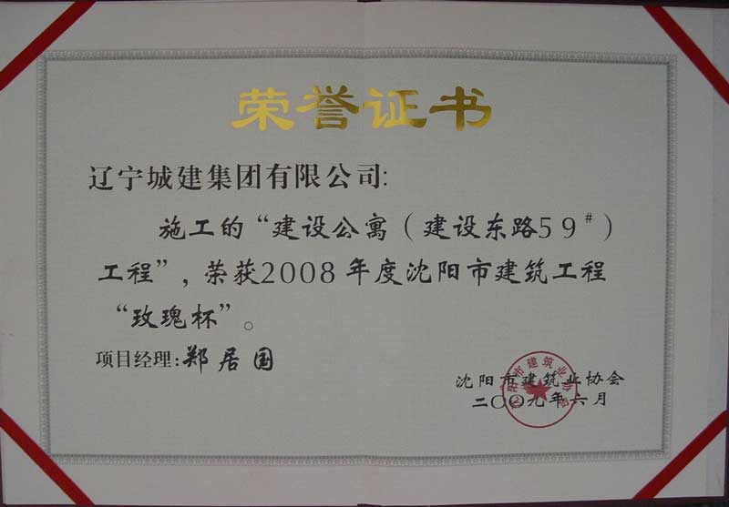 建设公寓:铁西区建设公寓工程位于沈阳市铁西区建设东路,建筑面积15000平方米,框架剪力墙结构。先后荣获沈阳市施工现场管理“新貌杯”和沈阳市建筑工程“玫瑰杯”奖。