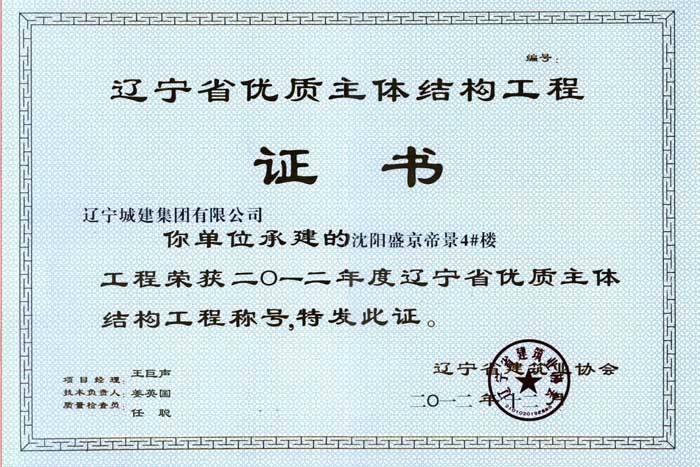 运河湾3号(盛京帝景)工程:位于沈阳市大东区,5幢高层住宅,总建筑面积45700平方米,框架剪力墙结构,先后荣获辽宁省建筑工程“优质主体结构”奖和沈阳市建筑工程“玫瑰杯”奖。
